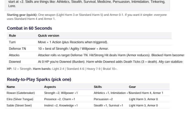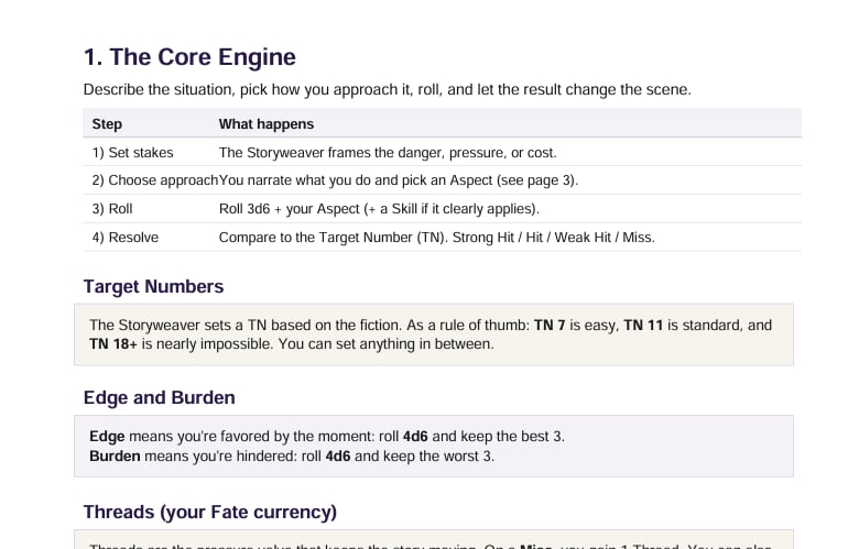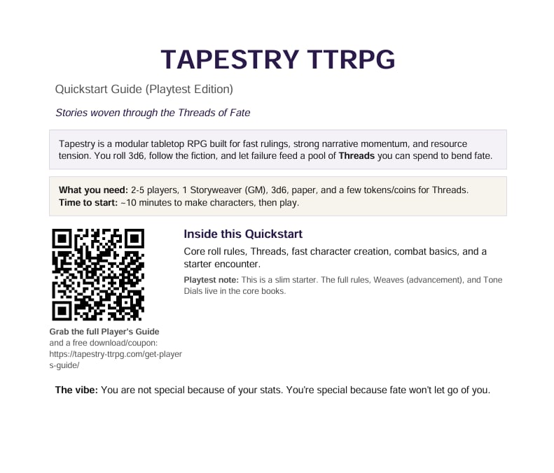 This Quickstart Guide is a lightweight on-ramp—enough to understand the core loop and run a short starter encounter.